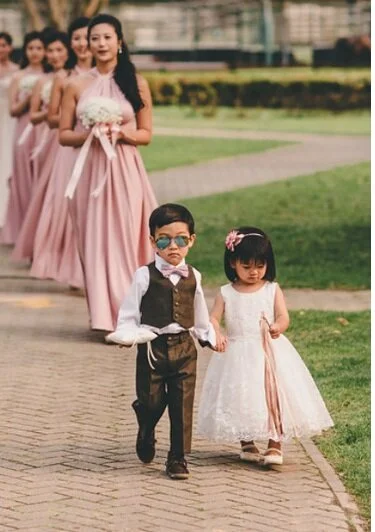 B&J chose to celebrate their day of love in one of the only venues in Hong Kong big enough to host an alfresco wedding banquet for 300+ guests. The couple was married under a dreamy wedding altar, with the endless sky and symbolic century old trees as a stunning ceremony backdrop. Hand painted rose gold picture frames, glass bottles and vases provided a warm yet elegant accent to the venue and decor - a tribute to this fun loving couple.